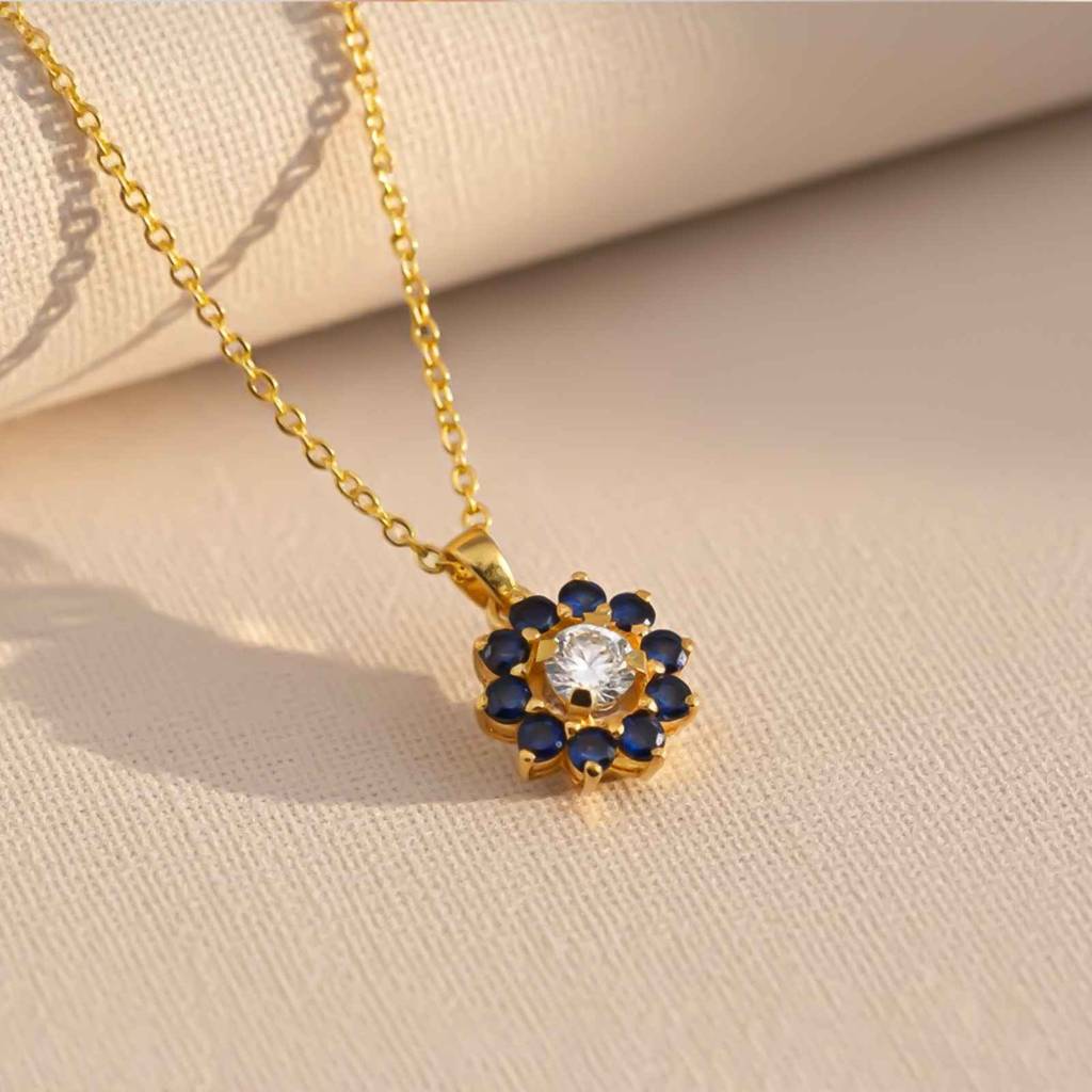 ZALKARISilver Blue Sapphire Floral Halo Pendant